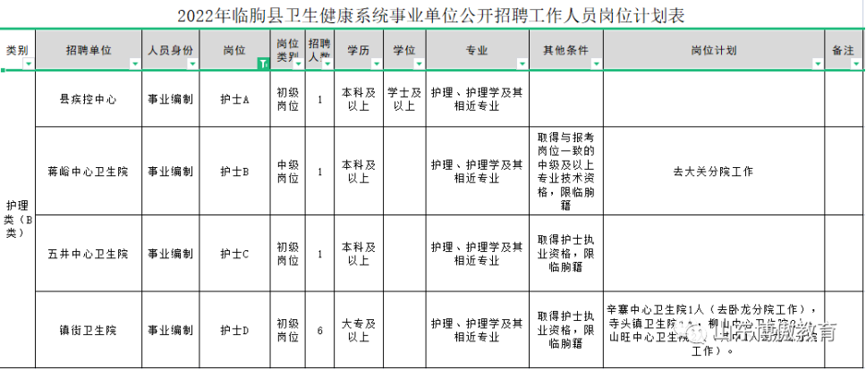 具体招聘单位、招聘岗位、招聘人数及条件要求详见附件《2022年临朐县卫生健康系统事业单位公开招聘工作人员岗位计划表》。